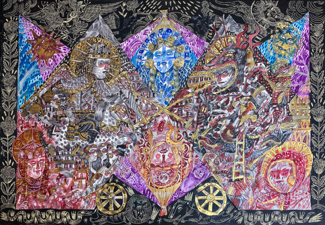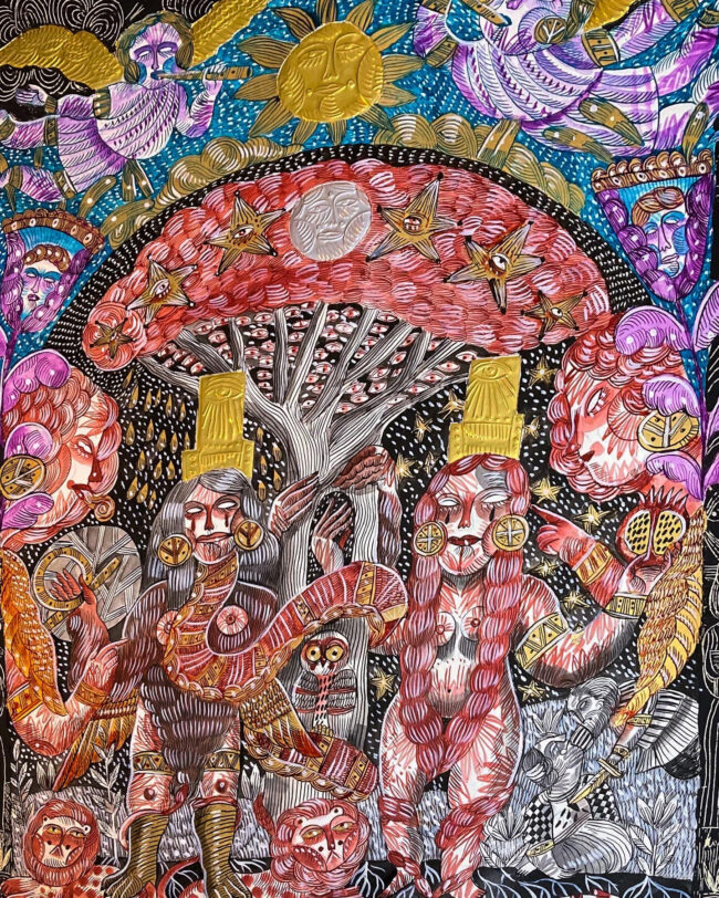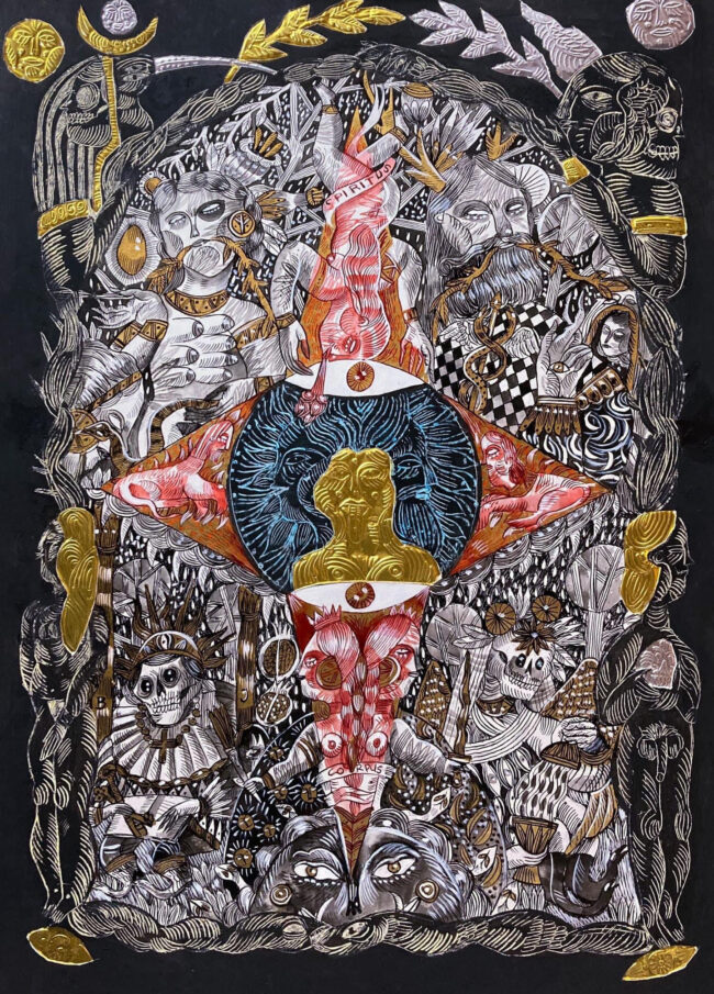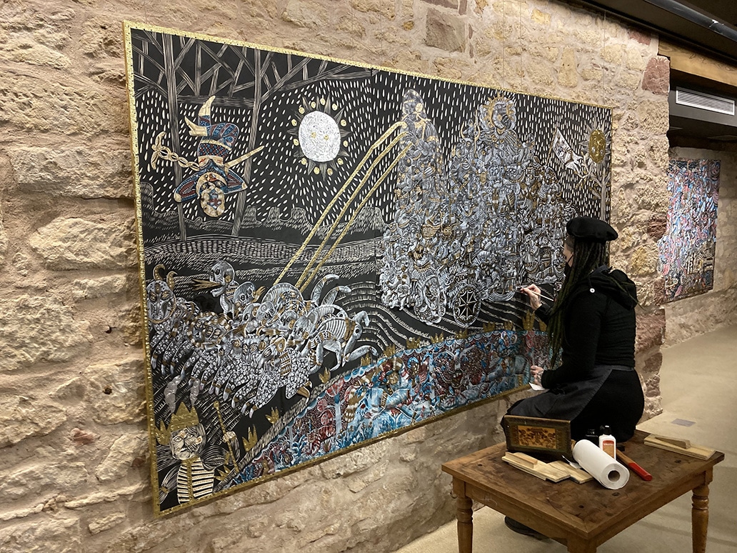 Fresques épiques, complètement remplies de ses images archétypales deviennent un cheminement spirituel pour ceux qui prennent le temps de voir. Voir au-delà de la profusion compulsive et cathartique de l’artiste est méditer sur les secrets soufflés par les esprits anciens. Mina Mond vous invite dans son monde ou se mêle actualités, hermétisme, alchimie, et folklore.