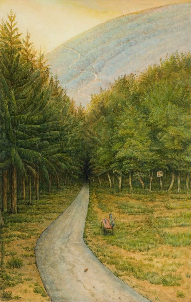 l’univers de Mitsuo Shiraishi où tout est questionnement : une forêt dense, un chemin qui serpente dans la colline…
